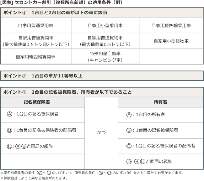 一般的な適用条件を表にまとめましたが、条件のなかで注目すべきなのが「ポイント③ 2台目の記名被保険者、所有者が以下であること」という項目。「自分の条件がよくわからないけど、とりあえず1台目は11等級以上で2台目を購入予定」という方は、契約中の保険会社に相談してみてはいかがでしょうか。
