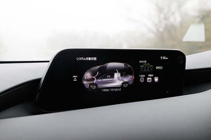 ▲ウルトラリーンの状態になると、モニターに「SPCCI」と表示されるスカイアクティブXは、最大出力とトルクこそ決して目立つ値ではないが、通常のガソリンNAエンジンでいえば2.2Lを超えるスペックである。