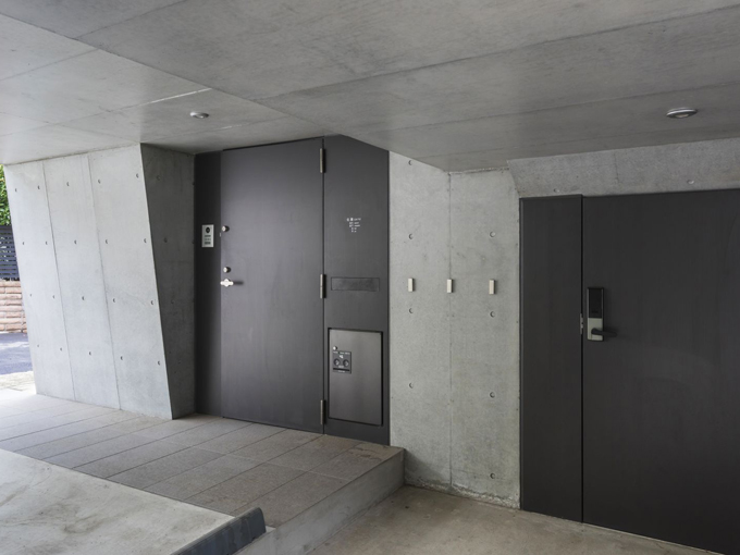 ▲左の扉が玄関。右側は収納スペースの扉で、ここにゴルフバッグなど趣味のグッズを収めておけば車への積み降ろしが容易