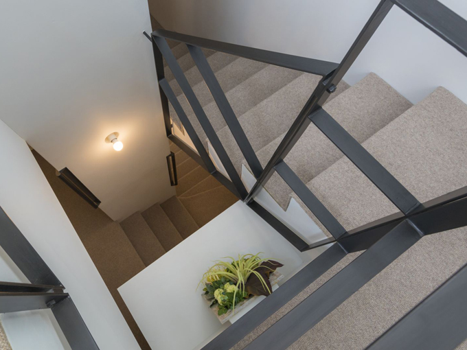 ▲玄関を入るとすぐに階段があり、半階分ほど上がったところで右に曲がれば2階のLDKへと続く。突き当たりの左側には壁に同化した扉があり、その奥はクローゼットになっている。動線を考え、コートなども収まる。このクローゼットの床の一部は、ガレージに扉がある収納スペースの天井とつながり、行き来が可能