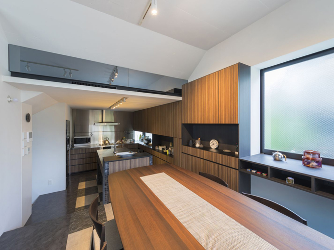 そのズレが、外観上の天井や窓のズレを生んでいる。とはいえ、逆L字型に配されたLDKは、ほぼワンフロア分の面積ゆえ、家族4人にとって十分な広さだ(リビングのみステップ3段分ほどフロアが高い)。