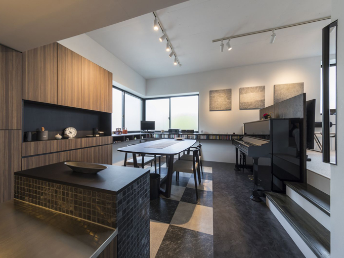 ▲モザイク大理石が好きだという佐藤さんはそれを生かすような収納材や家電選びにこだわった。奥さまが奏でるピアノも置かれている