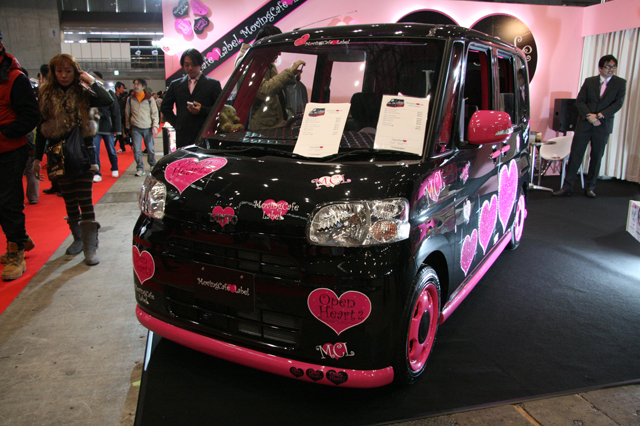 そしてもう一台セレクトしたのはこちらのタント。ダッシュボードをデコレーションしたり、ピンク色のエアロパーツを各部に装着したり、さらにボンネット、両サイドにはロゴステッカーをあしらった超キュートな“デコ”仕様。カスタマイズと言えば「オトコの趣味」という印象がありますが、見慣れたコンパクトカーもこんなふうに手を加えればカワイイ女の子仕様の車に大変身しちゃうんです。