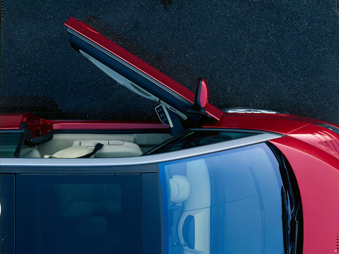 たしかにシルエットはミニバンっぽいかもしれないけど、じつは2ドア(ドアの長さは1.4mもある!)のクーペであり、しかもセンターピラーのないハードトップであり、さらにはボタンひとつで頭上の広大なガラスルーフと窓ガラスが同時に開くというカブリオでもあるんだ。