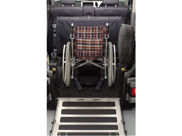 車いすを乗せる際には、バックドアを開けてまずニールダウンスイッチを押す。すると車高が約90mmも下がる。こうすることでスロープ角度が低くなり、車いすを乗せやすくなる。あとはスロープを降ろして車いすを固定させるベルトを車いすにかけ、乗員ごと車いすを運び入れる。車いすを固定したら、最後に先ほどのニールダウンスイッチで車高を元に戻す。