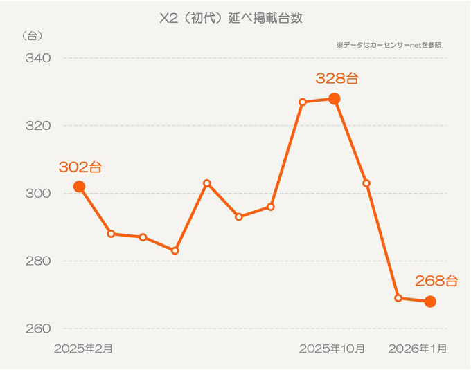 ▲2025年2月~2026年1月までの延べ掲載台数推移そんな初代X2ですが、カーセンサーnetを見ると100万円台半ばから流通している模様。果たしてこれは選んで大丈夫なのでしょうか? 次章以降でオススメの選び方を解説していきましょう!